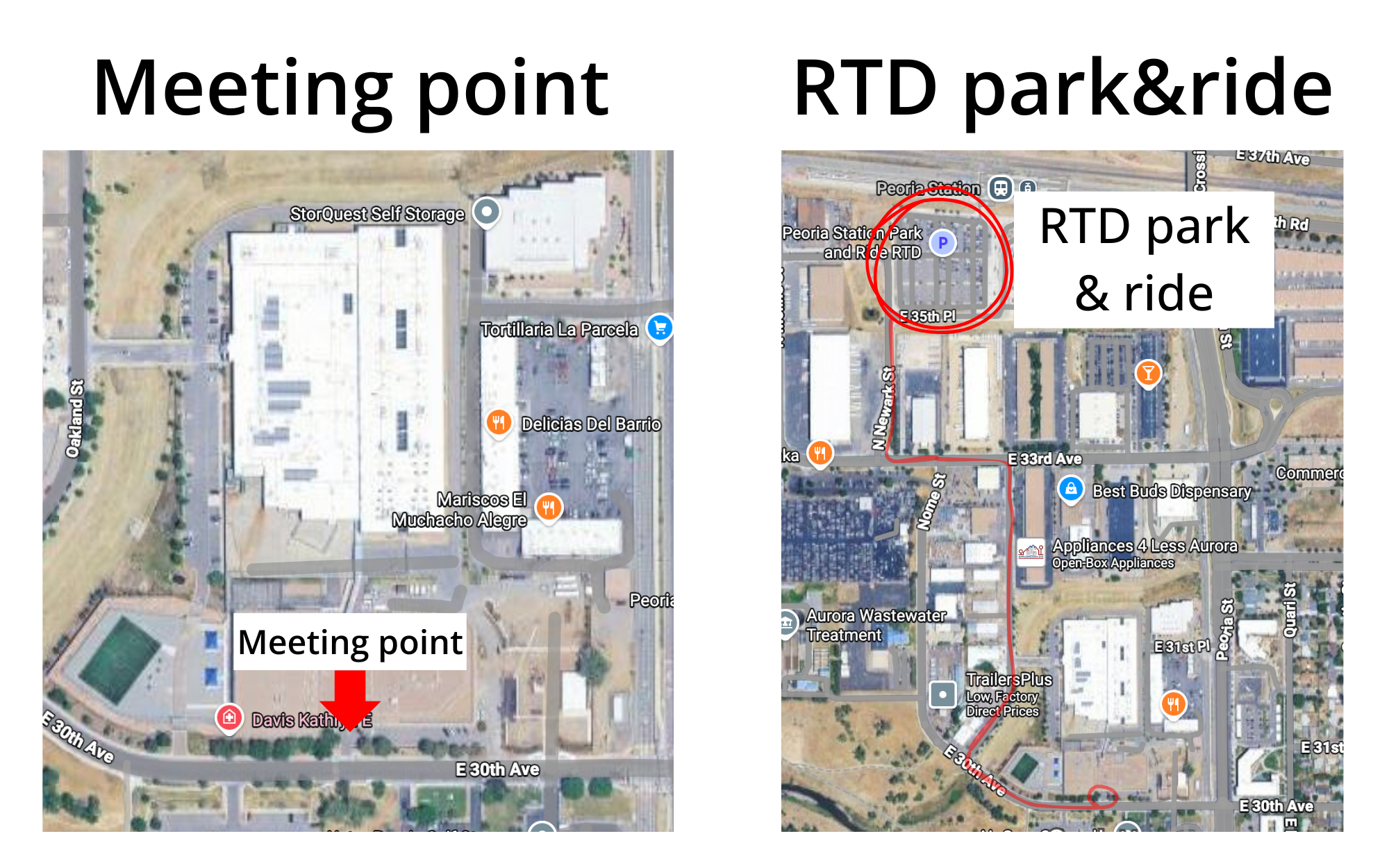 Parking: Some street parking is available along Oakland street. There is also an RTD park & ride located at 11703 E 35th Place, Aurora, CO.